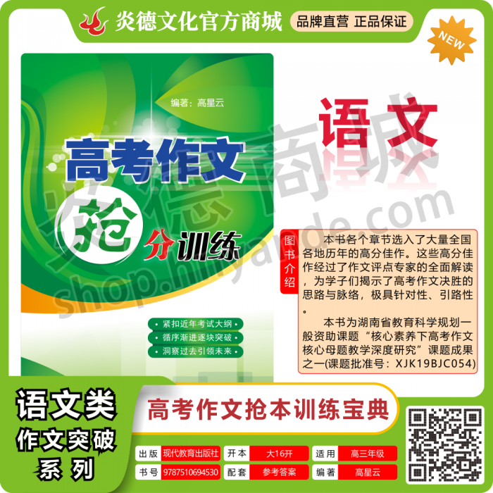 前瞻走向性:本书第四篇为高考作文核心母题写作训练篇。本篇展示了本书主编主持的"核心素养背景下高考作文核心母题深度教学"课题研究成果(课题批准号:XJK19BJC054)。主编根据近三年高考作文命题规律,得出"高考作文必考中国中学生发展核心素养"这一结论,为此,课题组精心拟制了18道关于核心素养的作文模拟试题,并对其做出精准的考题解析,提供了文质兼美的佳作,以此供同行们参考,供学子们练习。