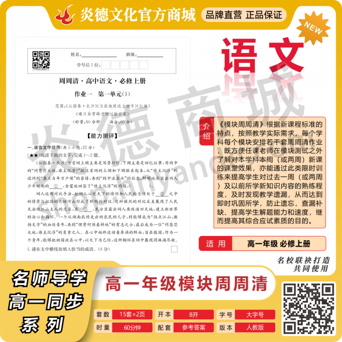 为适应“双休”的政策要求,帮助老师、家长在周末期间随时掌控学生的自主学习情况,帮助学生有目的、有计划地巩固已学知识内容,用限时限量的形式,培养学生自觉、自律、自主学习的良好习惯,我们特组织长沙市一中、湖南师大附中、长沙市雅礼中学等名校名师根据《普通高中课程方案和语文等学科课程标准(2017年版2020年修订)》编写了本系列同步练习册——《模块周周清》。